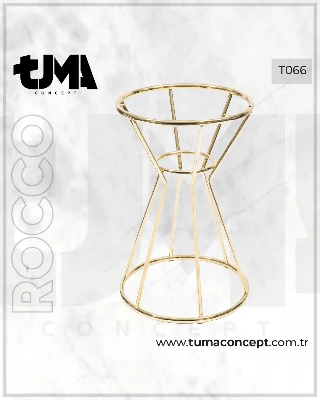 Tuma Concept T066 ROCCO: gold renk tel-çubuk konik orta ayak. Havadar görünüm, yüksek stabilite, toz fırın boya yüzey ve kolay montaj. Cafe ve ev projelerinde şık çözüm.